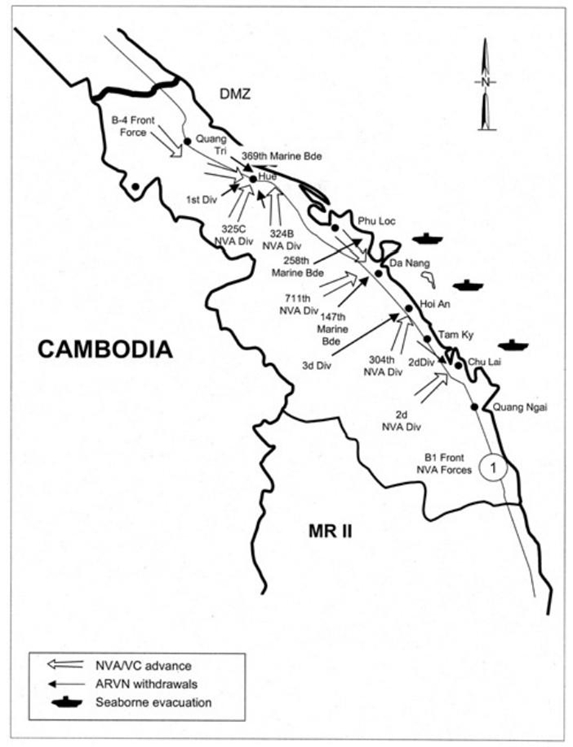 Việc rút lui khỏi Huế là một thảm họa không thể cứu vãn. Quân miền Nam đã bắt đầu trận chiến ở phía bắc Quân đoàn I trong tình trạng khá tốt. Nhiều binh lính và TQLC đã chiến đấu anh dũng, nhưng những mệnh lệnh khó hiểu dẫn đến việc từ bỏ các vị trí phòng thủ vững chắc đã làm suy yếu tinh thần của quân đội. Lãnh đạo kém, tính đoàn kết và kỷ luật của đơn vị đã tan rã, và nỗi lo lắng về an nguy của người thân đã nhanh chóng dẫn đến sự hoảng loạn và vô pháp hoàn toàn. Tình hình tệ hại đến mức quân đội thậm chí không thèm phá hủy vũ khí và thiết bị mà họ bỏ lại. Một sĩ quan báo cáo rằng mình đã để lại 37 xe tăng, tất cả đều đã được tiếp nhiên liệu và còn hoạt động, trên bãi biển khi anh ta và những người lính của mình chạy đến các tàu. Một sĩ quan cấp cao khác, khi đổ bộ lên Đà Nẵng, đã tóm tắt thái độ chung khi ông nói với một phóng viên, “Tôi thậm chí còn không biết vợ và gia đình mình ở đâu. Tại sao tôi phải quan tâm đến chỉ huy sư đoàn của mình?” Chỉ khoảng một phần ba binh lính cuối cùng đến được Đà Nẵng, và vô số dân thường đã chết trong cuộc di tản hỗn loạn đầy đau đớn. Sư đoàn 1 VNCH, niềm tự hào của quân đội, “đã mất đi không còn là một lực lượng có thể nhận dạng được” và không bao giờ được tái lập.