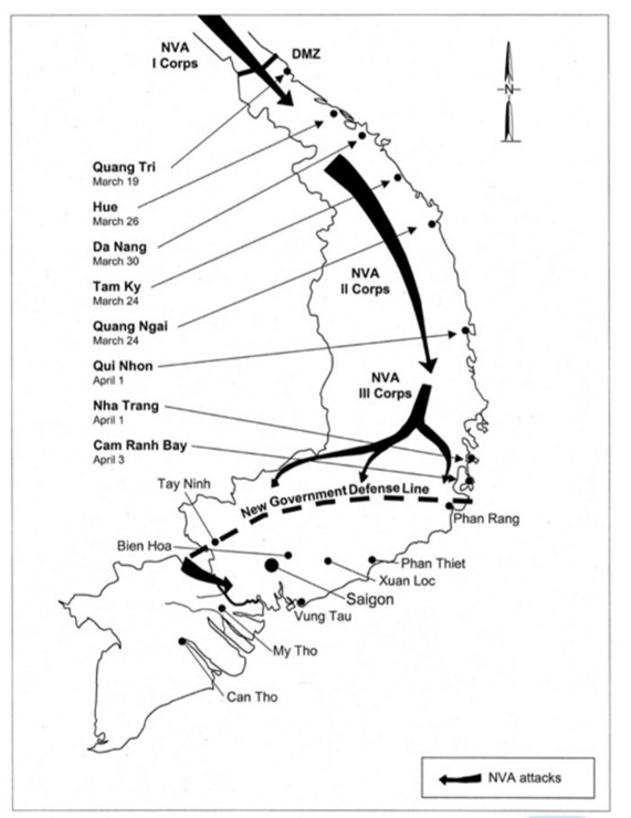 Đến ngày 1 tháng 4, lực lượng Bắc Việt đã chiếm giữ toàn bộ Quân khu I và hầu hết Quân khu II. Khi chiếm được những khu vực này, họ đã tiêu diệt được ưu thế của hai quân đoàn VNCH đại diện cho hơn một nửa sức mạnh chiến đấu hiệu quả của QLVNCH. Tuy nhiên, một sư đoàn, Sư đoàn 22, đã cố gắng trụ vững ở Quân khu II, kiểm soát ba thành phố Qui Nhơn, Tuy Hòa và Nha Trang. Bốn trung đoàn của sư đoàn, Trưởng phòng Tình báo DAO Le Gro đánh giá, không chỉ “chiến đấu giỏi mà còn dũng cảm” dưới quyền Chuẩn tướng. Tướng Phan Đình Niệm chống lại sư đoàn 3 và 968 quân Bắc Việt, được tăng cường bởi Trung đoàn Độc lập 95B. Nhưng quân phòng thủ VNCH đã bị áp đảo và phải di tản bằng đường biển khi quân tiếp viện Bắc Việt bắt đầu tràn vào khu vực từ phía bắc sau trận chiến Đà Nẵng. Tuy nhiên, một số vẫn muốn ở lại chiến đấu. Theo Tướng Viên, hai trung đoàn trưởng của Sư đoàn 22 đã cầu xin chỉ huy sư đoàn ở lại tử thủ. Khi bị ông từ chối lời yêu cầu, viện dẫn đó là mệnh lệnh, hai đại tá đã từ chối rời đi và tự kết liễu đời mình. Chỉ có khoảng 2.000 sĩ quan và binh lính trốn thoát. Đến giữa tháng 4, Bắc Việt đã hoàn thành việc phá hủy một số ít ổ kháng cự của QLVNCH, và các tỉnh còn lại dọc theo bờ biển “sụp đổ như một hàng bình sứ trượt khỏi kệ”. (Xem bản đồ 17.)
