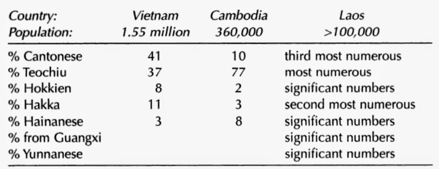 Đến thập niên 1970, thống kê về số người Hoa ước lượng khoảng là 1,55 triệu người tại Việt Nam, 360.000 người ở Cambodia và hơn 100.000 người ở Laos. Theo thống kê của Zhang Wenhe, Liang Ming, Cai Tian, Overseas Chinese Yearbook 1972, Overseas Chinese Economy Yearbook 1975-1976, William E. Wilmott, dân số người Hoa phân loại theo tiếng nói theo bảng sau đây (4).