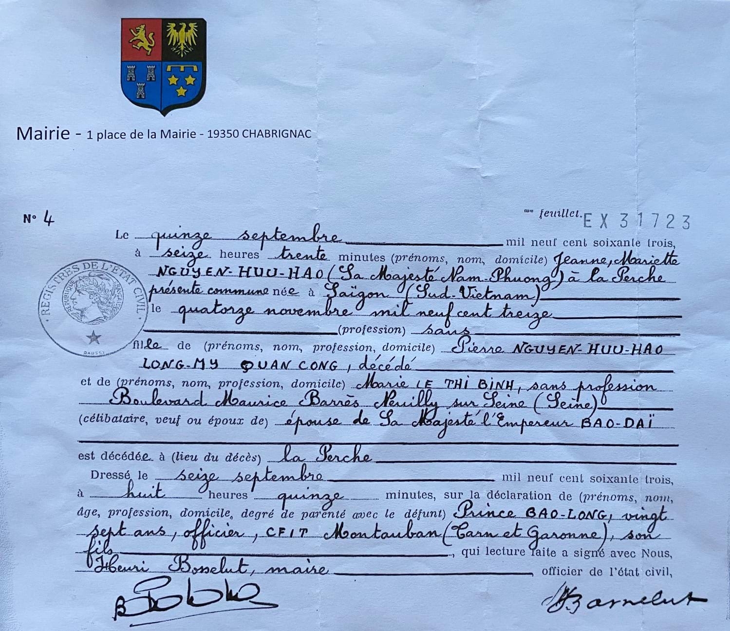 3. Bản sao giấy khai tử chứng nhận Jeanne Mariette Nguyễn Hữu Hào sinh ngày 14.11.1913, mất ngày 15.9.1963 tại Chabrignac lúc 16 giờ 30 phút. Người khai là Thái tử Bảo Long, 27 tuổi, sĩ quan. Giấy khai tử lập ngày 16.9.1963 lúc 8 giờ 15 phút, do Thị trưởng Henri Bosselut, viên chức hộ tịch, ký cùng với người khai, Thái tử Bảo Long. Bản sao giấy khai tử do Tòa thị xã Chabrignac cấp ngày 20.2.2023.