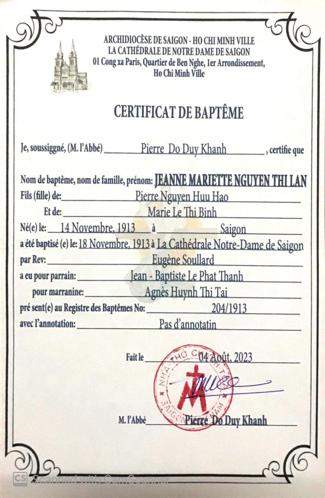 2. Bản trích lục sổ Rửa tội tại Thánh đường Sài Gòn năm 1913. Tòa Tổng giám mục Sài Gòn chứng nhận Jeanne Mariette Nguyễn Thị Lan sinh ngày 14.11.1913 tại Sài Gòn, được Linh mục Eugène Soullard rửa tội ngày 18.11.1913 tại Thánh đường Sài Gòn. Cha đỡ đầu là Jean-Baptiste Lê Phát Thanh, mẹ đỡ đầu là Agnès Huỳnh Thị Tài. Giấy chứng nhận do Linh mục Pierre Do Duy Khanh ký, cấp ngày 4.8.2023.