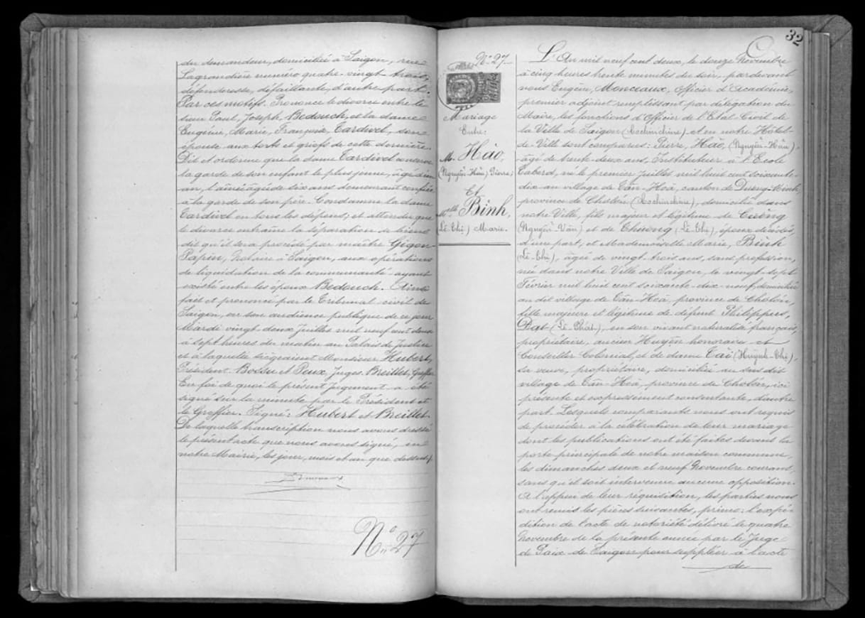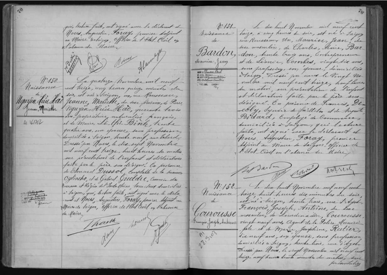 Hôm nay, ngày 17.11.1913 lúc 8 giờ sáng, người cha nói trên đã đem đứa trẻ đến trình diện và khai sinh trước mặt chúng tôi, người lập bản khai sinh này, trước sự hiện diện của Edouard Dussol, kế toán viên hãng Ogliastro, và Gabriel Gueldre, nhân viên Hải quan Đông Dương, cả hai cư ngụ tại Sài Gòn. Hai nhân chứng, sau khi đọc lại, cùng ký bản khai sanh này cùng với chúng tôi, Augustin Foray, Phó Đốc lý thứ nhứt, viên chức hộ tịch, thay mặt Đốc lý.